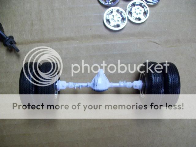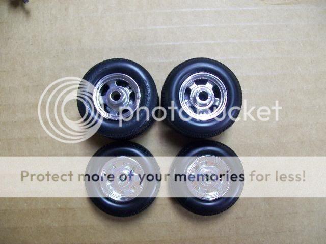 I took the wheel backings from the Silverado and used them on 4 wheels, for the rear wheels I stuck two wheels together and it looks like this....